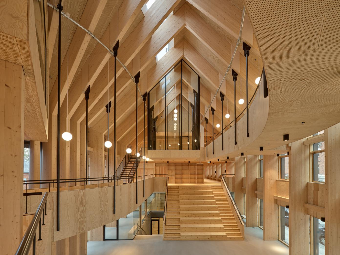 Byggeriet strækker sig over fem etager med udnyttede tagflader i flere niveauer.